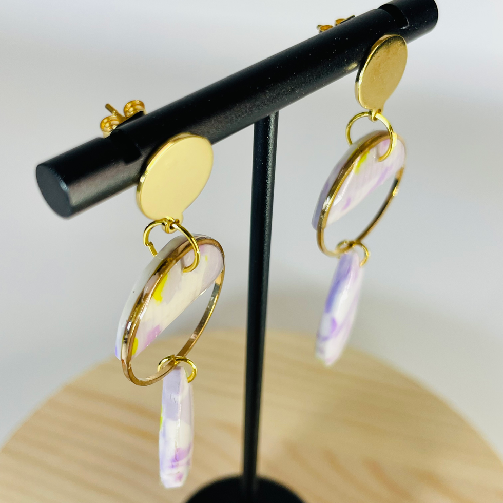 Delicate meets dramatic. A golden hoop frames a dreamy lilac-lime half-moon, finished with a sculpted petal drop. Botanical energy but make it neon-fresh.