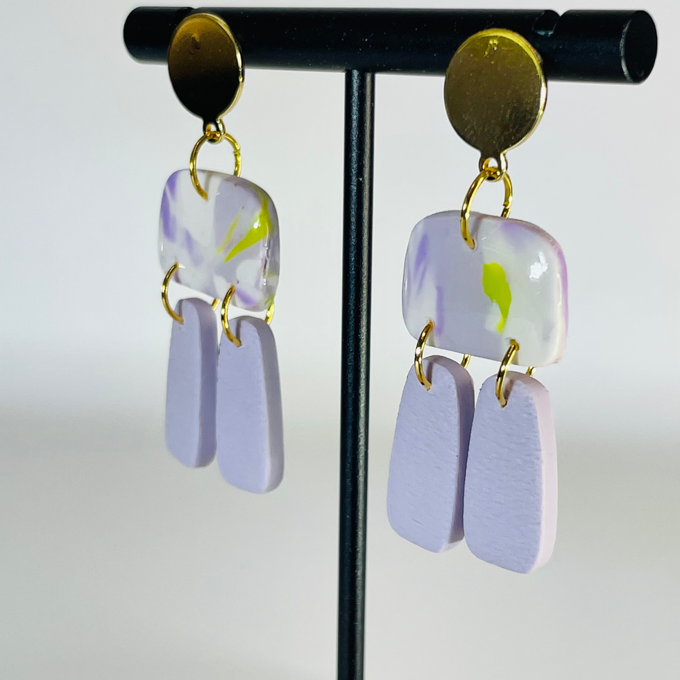 A marbled lilac-lime top paired with soft-textured lilac drops — like a pastel lemonade stand on earrings. Sweet with a twist… literally.